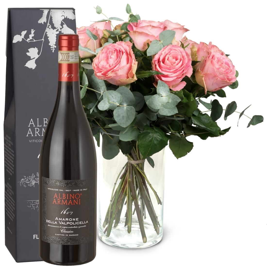 12 rosa Rosen mit Grün und Amarone Albino Armani DOCG (75cl)