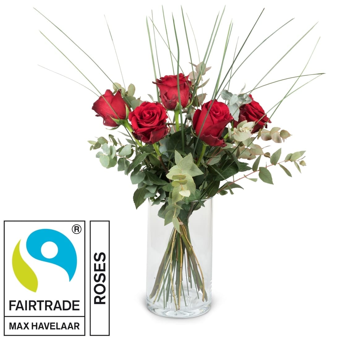 5 rote Fairtrade-Rosen Max Havelaar mit Grün
