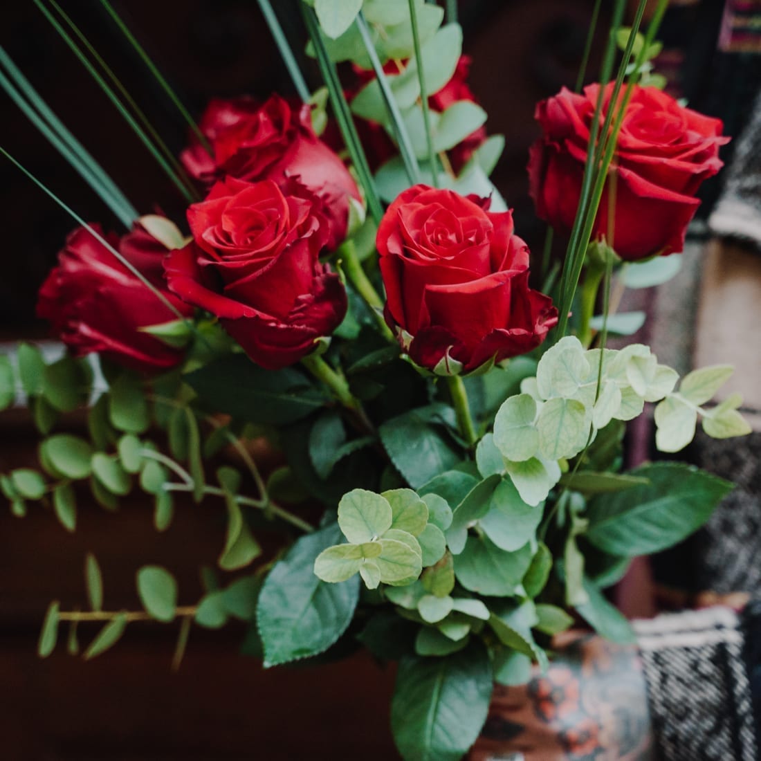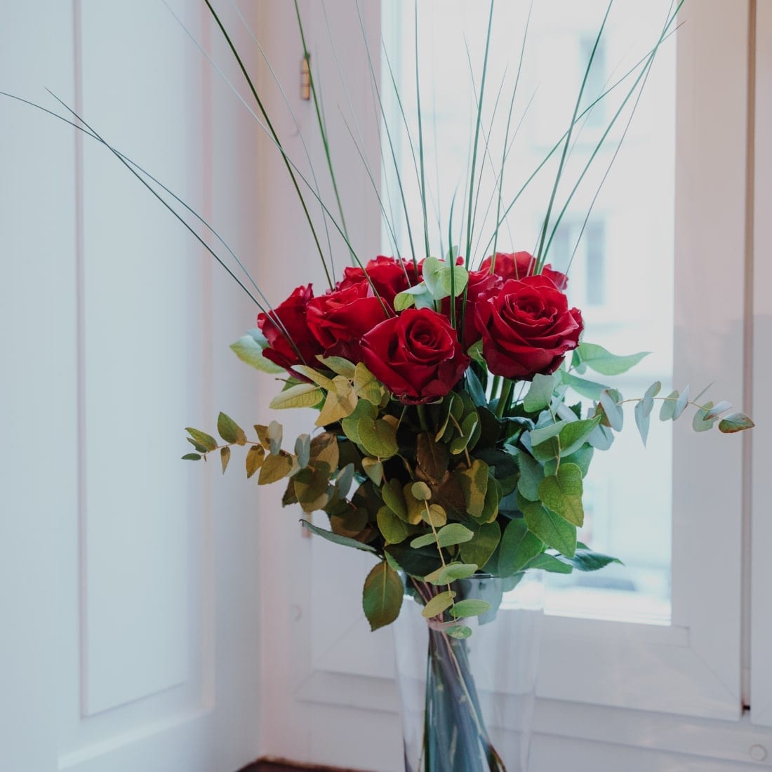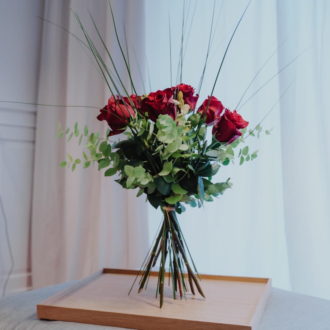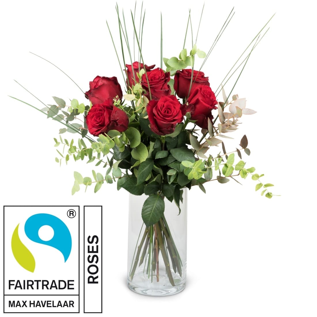 7 rote Fairtrade-Rosen Max Havelaar mit Grün