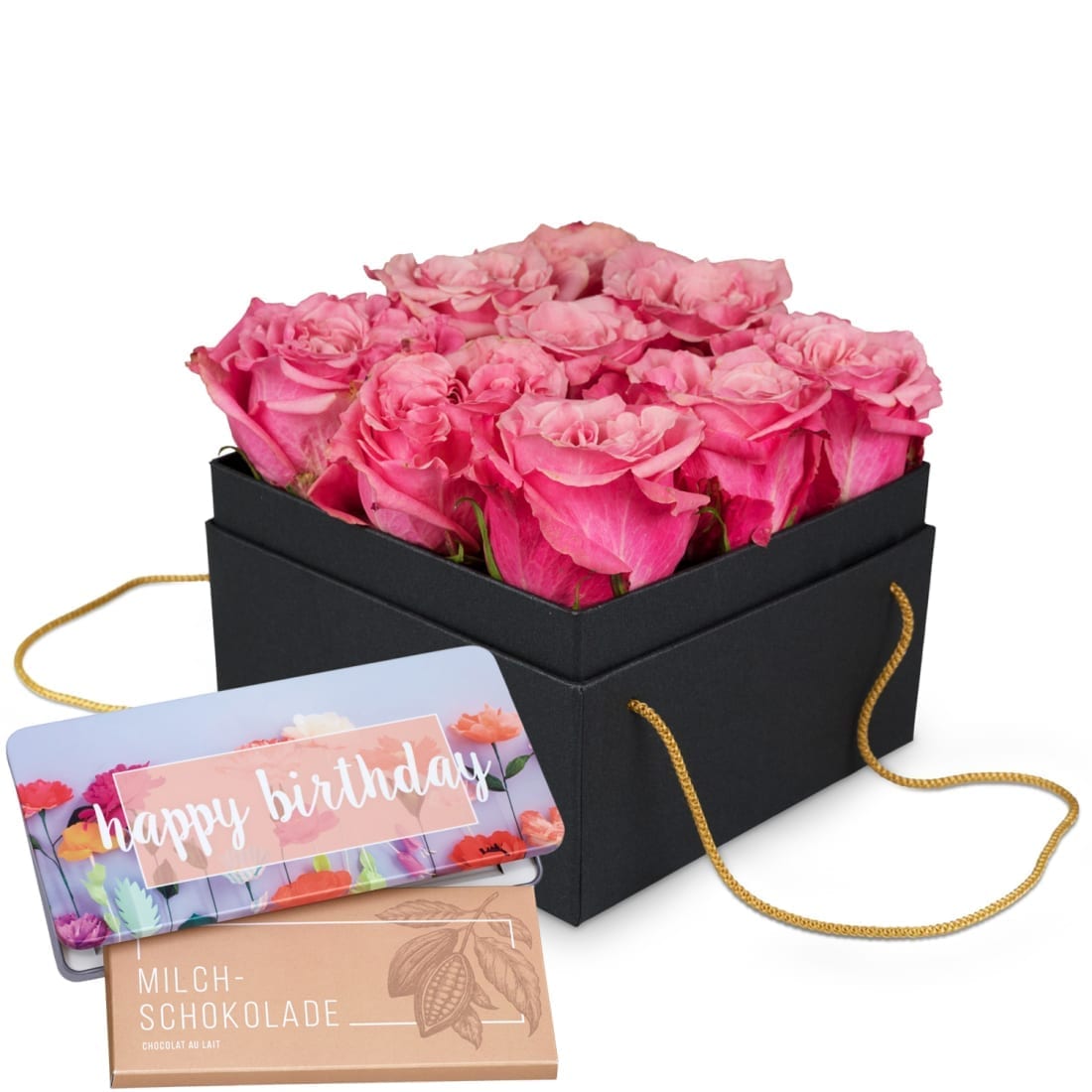Blumenbox «Lisbon» (15 cm) mit Schoggi-Tafel «Happy Birthday»