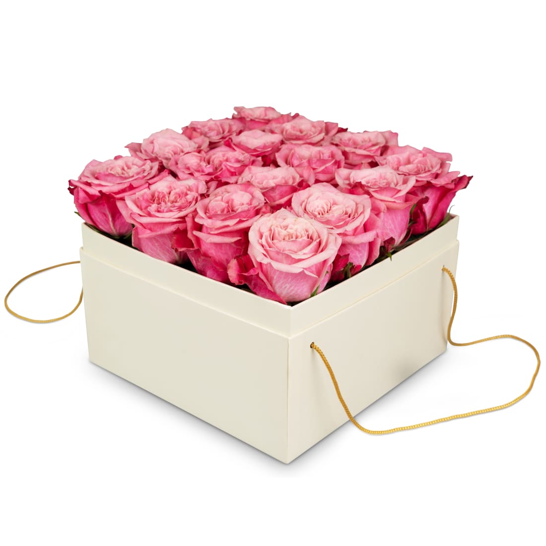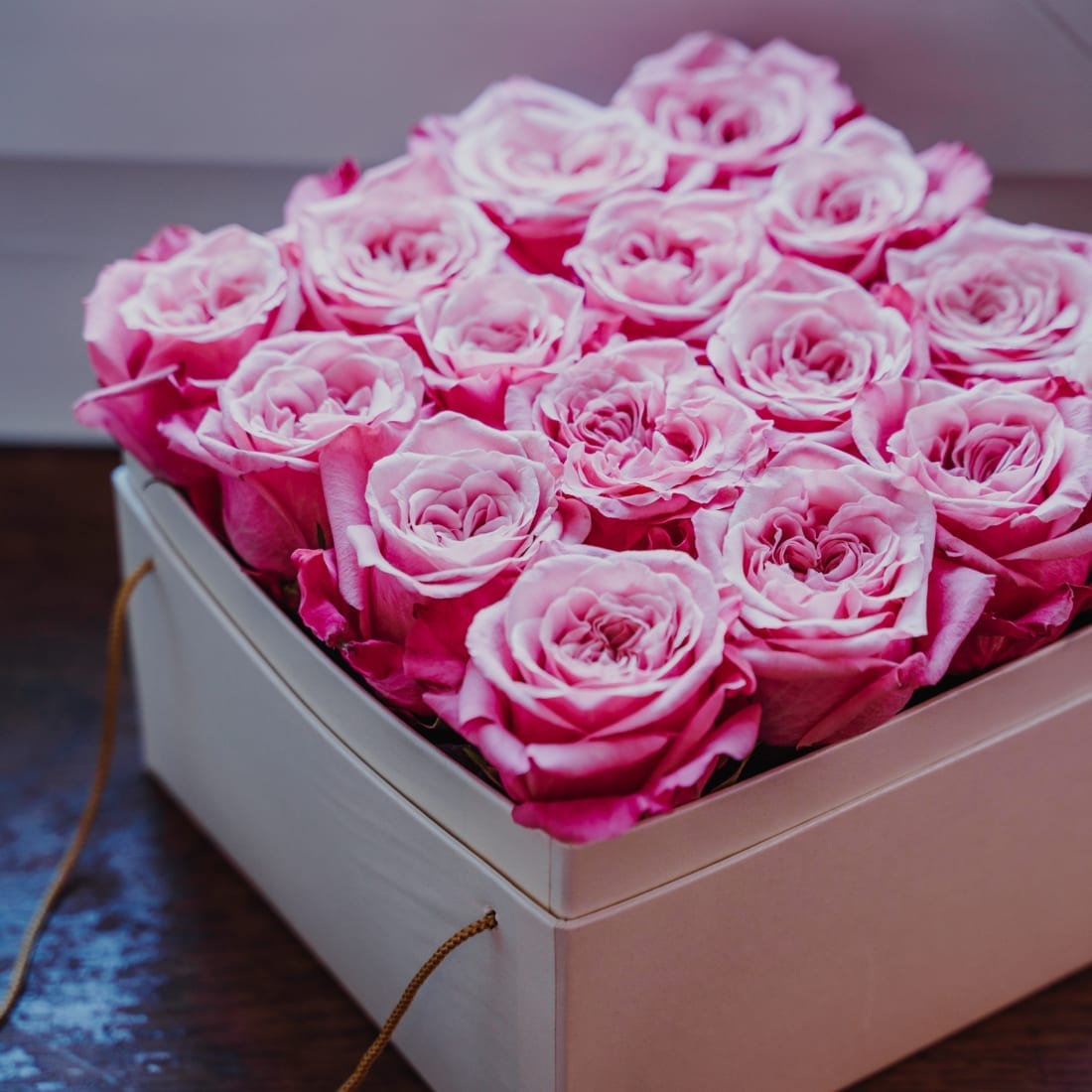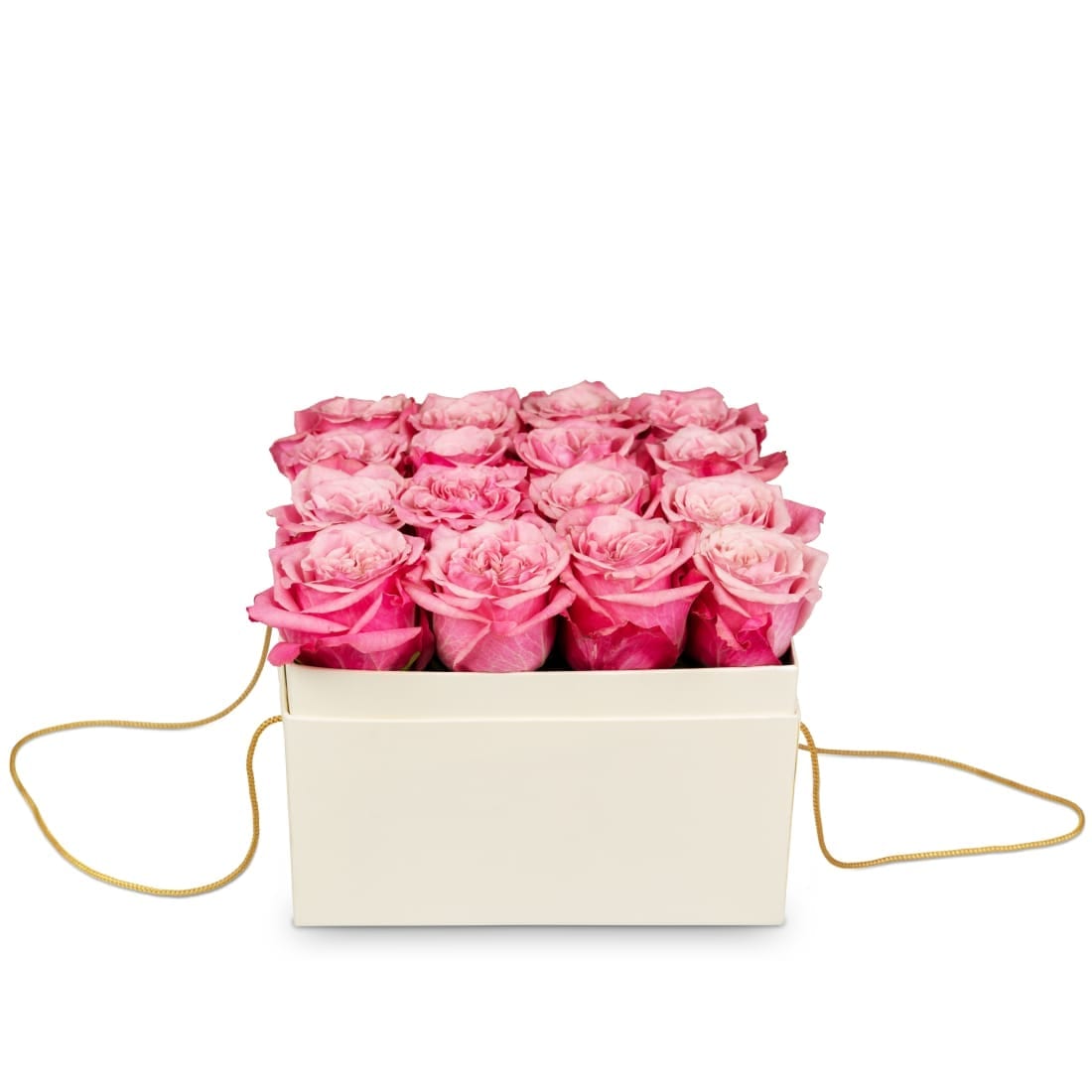 Diese elegante Rosenbox beinhaltet 16 pink-rosafarbene Rosen.