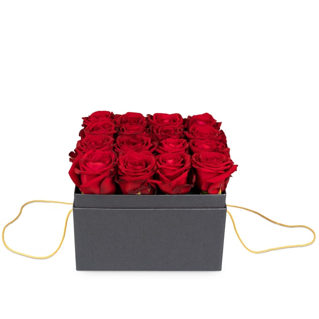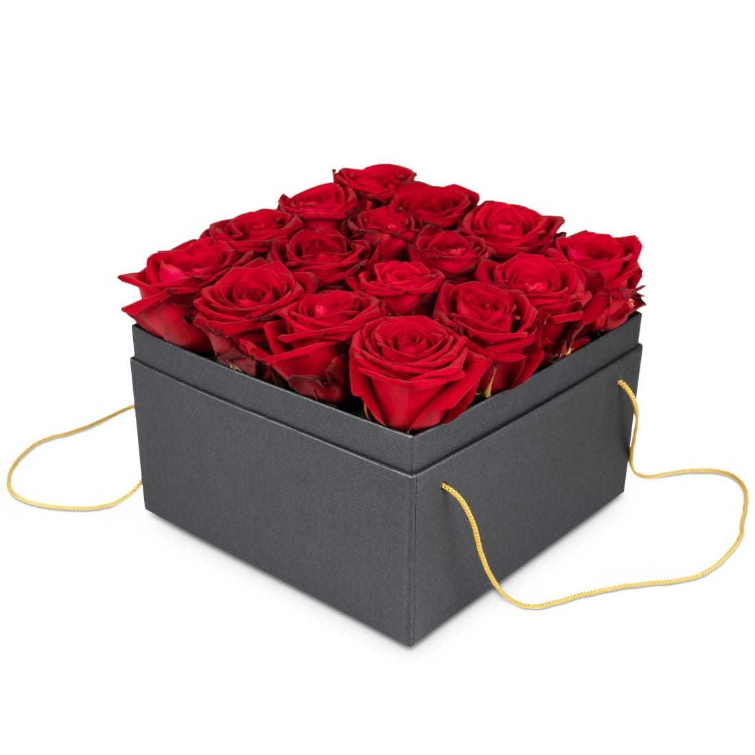 Diese elegante Rosenbox beinhaltet 16 rote Rosen.