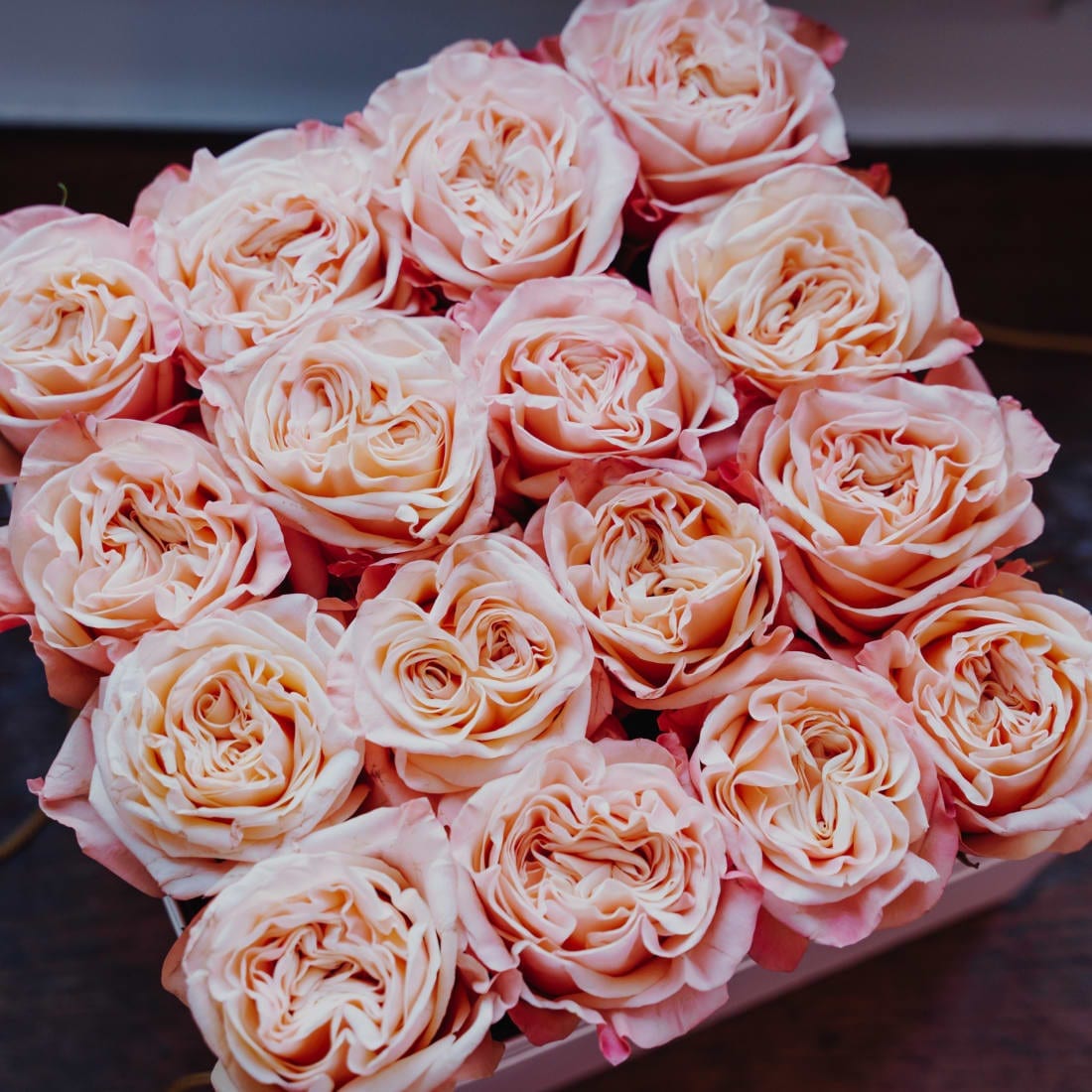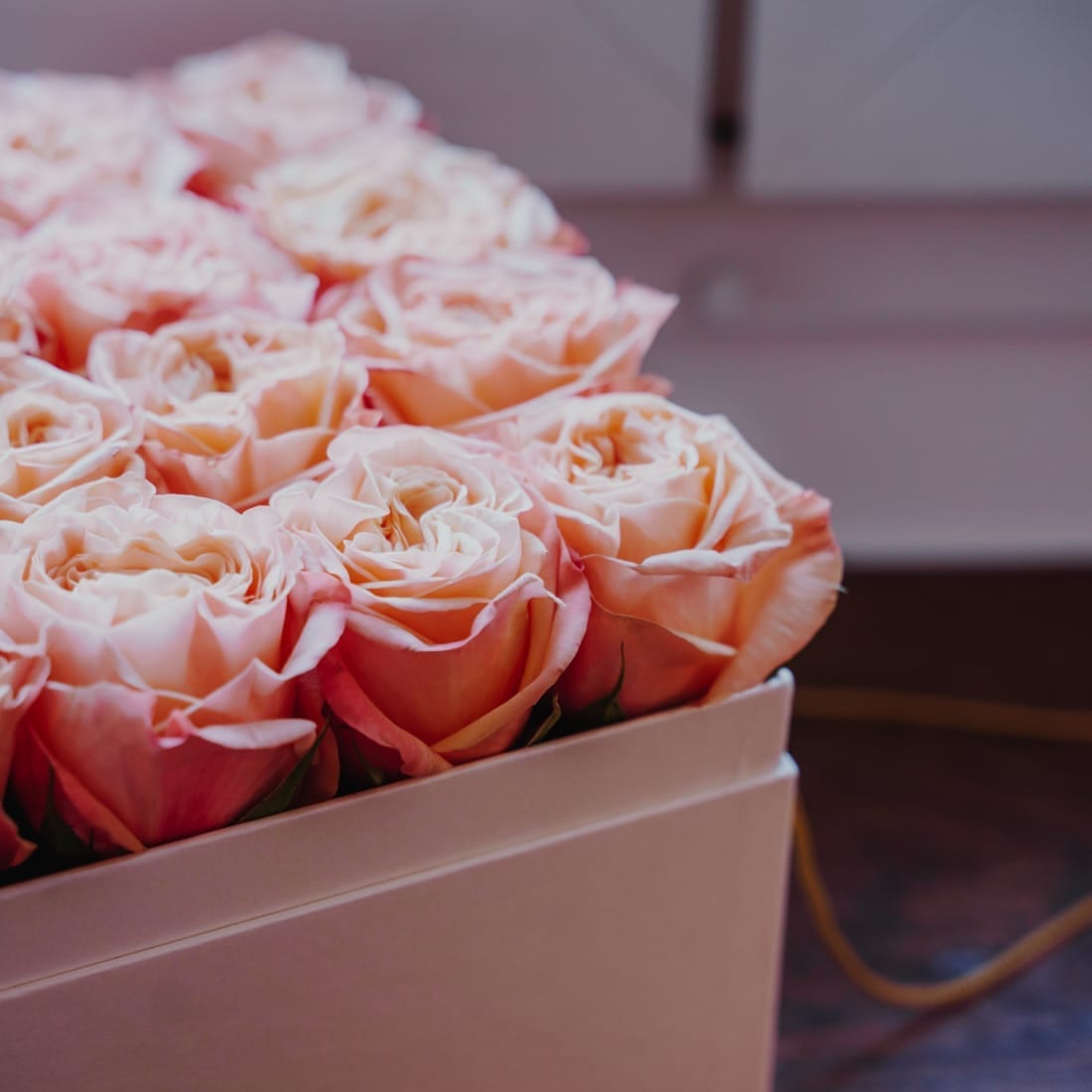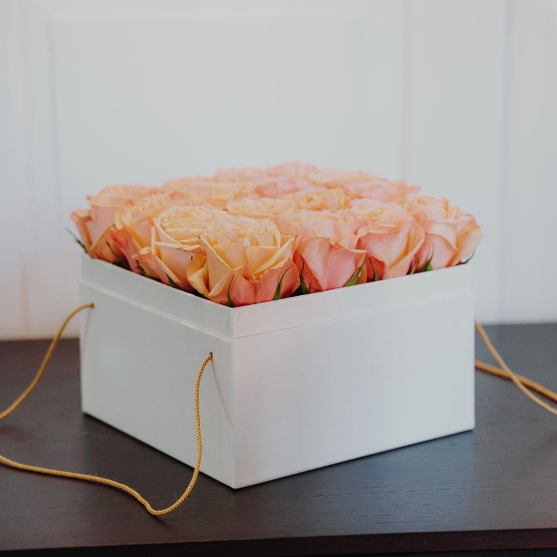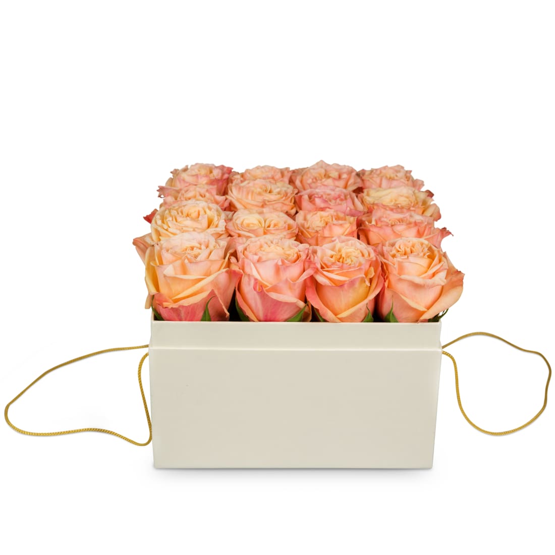 Diese elegante Rosenbox beinhaltet 16 lachsfarbene Rosen.