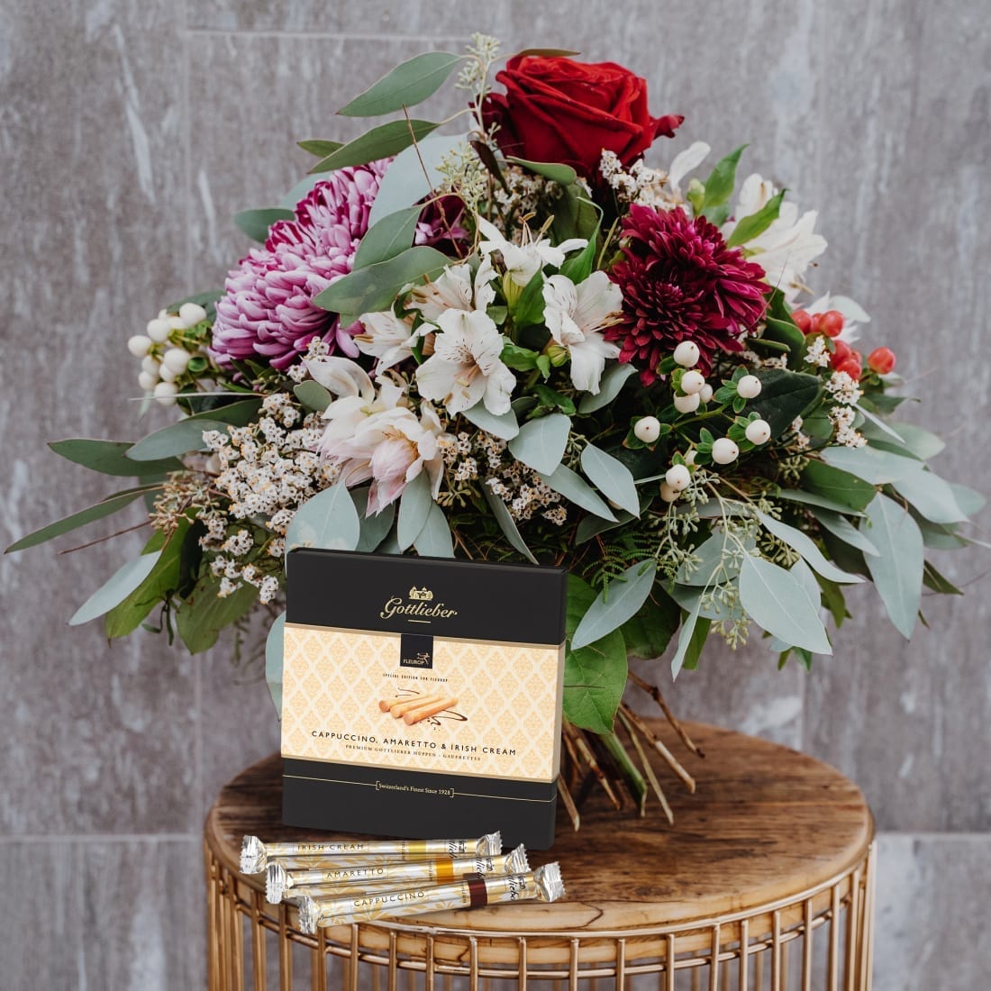 Dieser Blumengruss wird mit einer Packung Gottlieber Premium Hüppen Special Edition for Fleurop kombiniert.