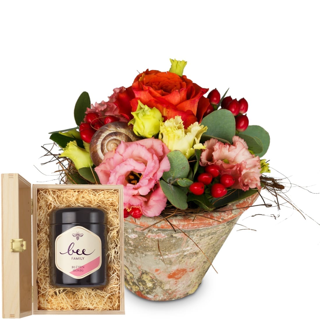 Mit Ihrem Blumengruss wird ein Glas hochwertiger, zertifizierter Schweizer Blütenhonig (350g) von Bee-Family in einer eleganten Geschenkbox überbracht.