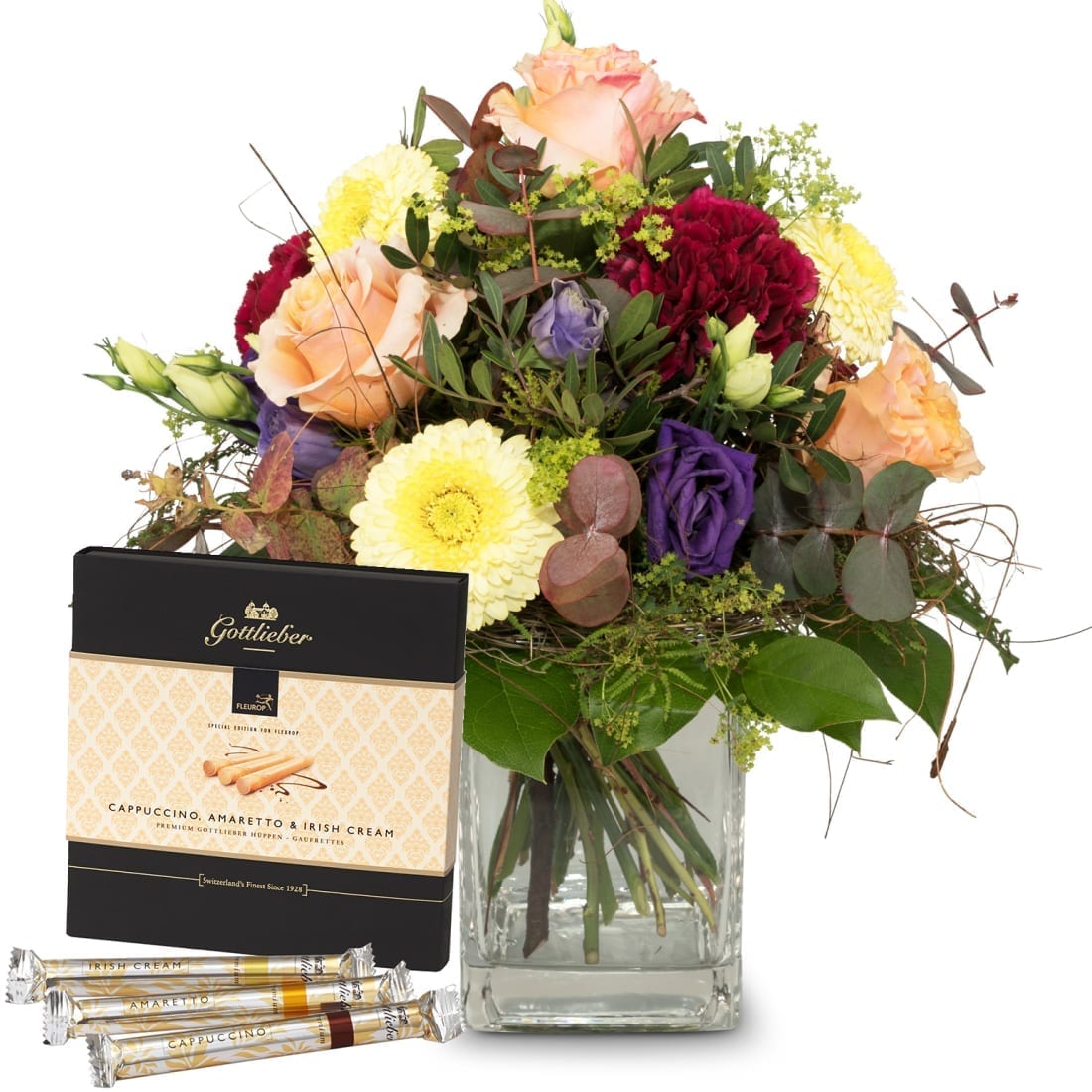 Dieser bunte Blumenstrauss macht Freude in allen Lebenslagen. Damit gelingt die Überraschung bestimmt. Dieser Blumengruss wird mit einer Packung Gottlieber Premium Hüppen Special Edition for Fleurop kombiniert.