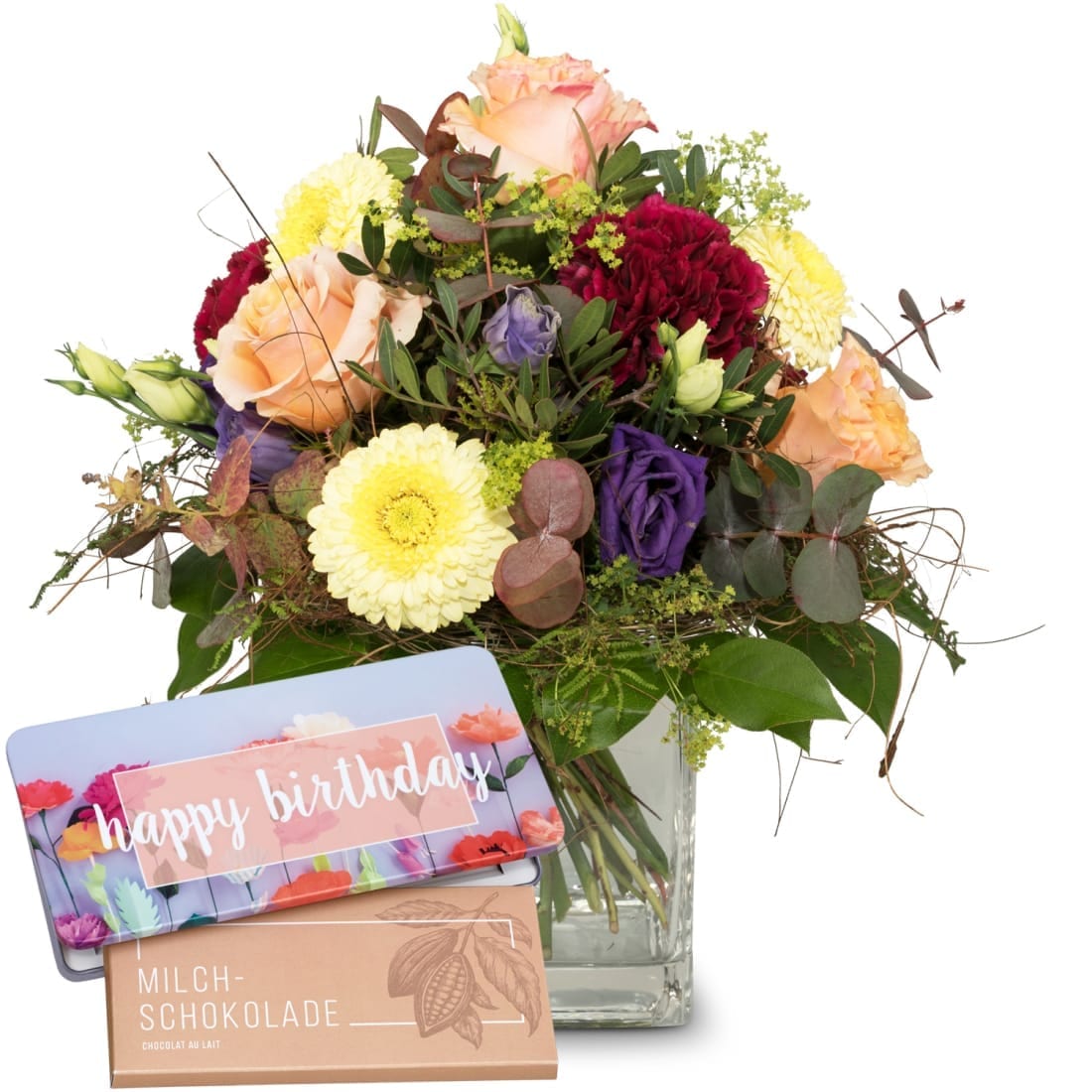 Bunter Blumentraum mit Schoggi-Tafel «Happy Birthday»