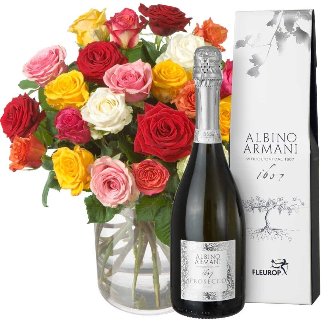 Bunter Rosenstrauss (24 Rosen) mit Prosecco Albino Armani DOC (75cl)