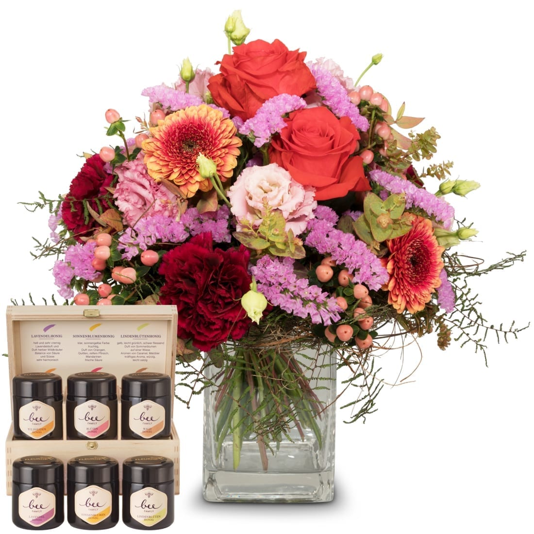 Mit Ihrem Blumengruss werden sechs verschiedene Honigsorten der Bee-Family in einer eleganten Geschenkbox überbracht.