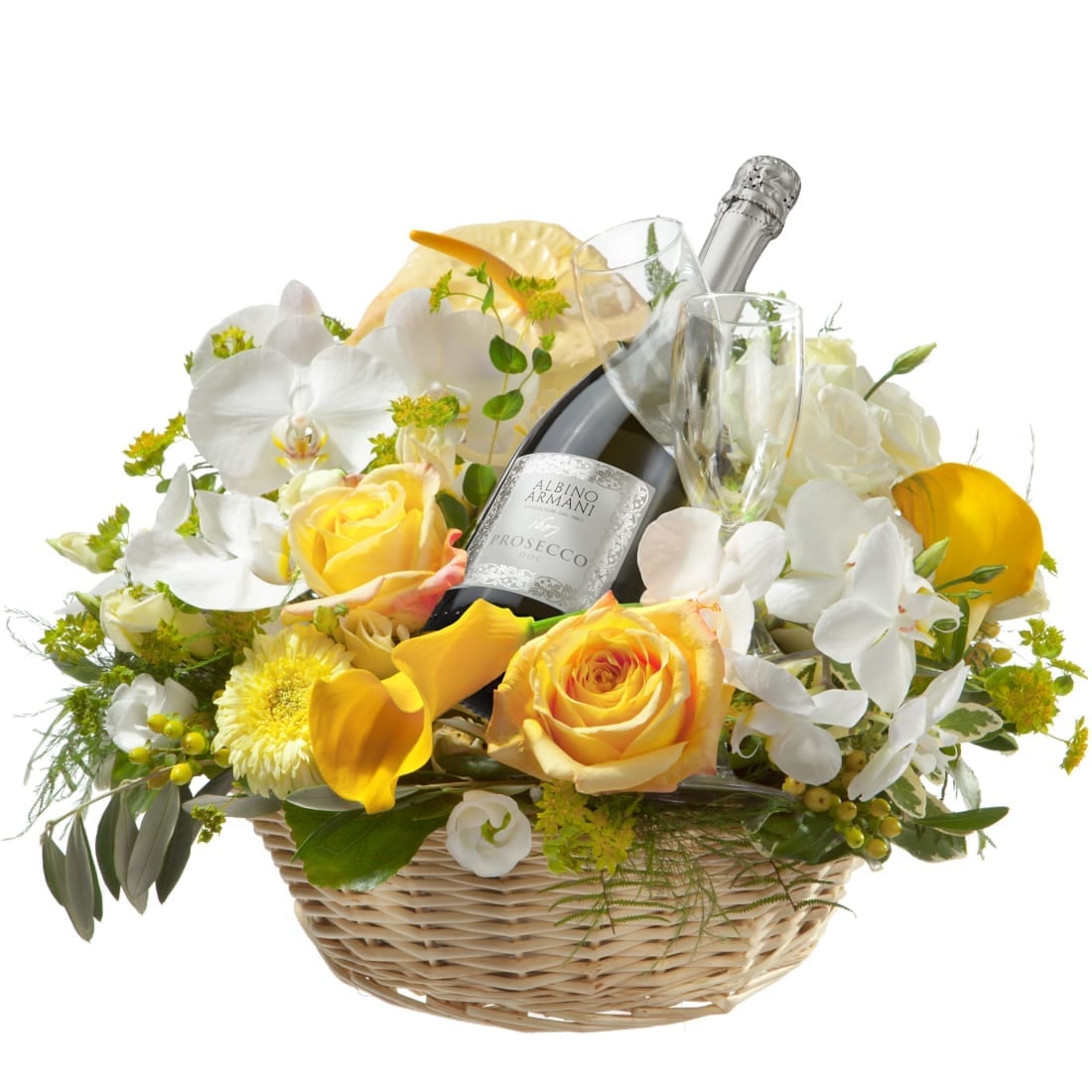 In diesen Blumengruss werden eine 75 cl Flasche exklusiver Prosecco Albino Armani DOC Extra Dry und zwei Gläser integriert.