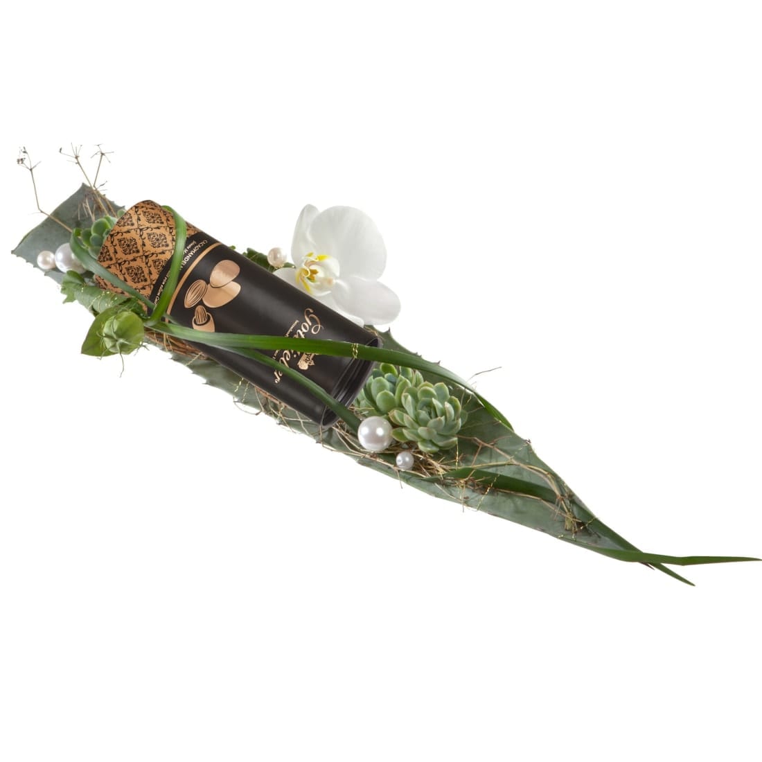 Dieser Blumengruss wird mit einer edlen Runddose Gottlieber Cacaomandeln (200g) kombiniert. Die Mandeln werden schonend geröstet, von zartschmelzender Schokolade umhüllt und mit edlem Kakaopulver bestäubt.