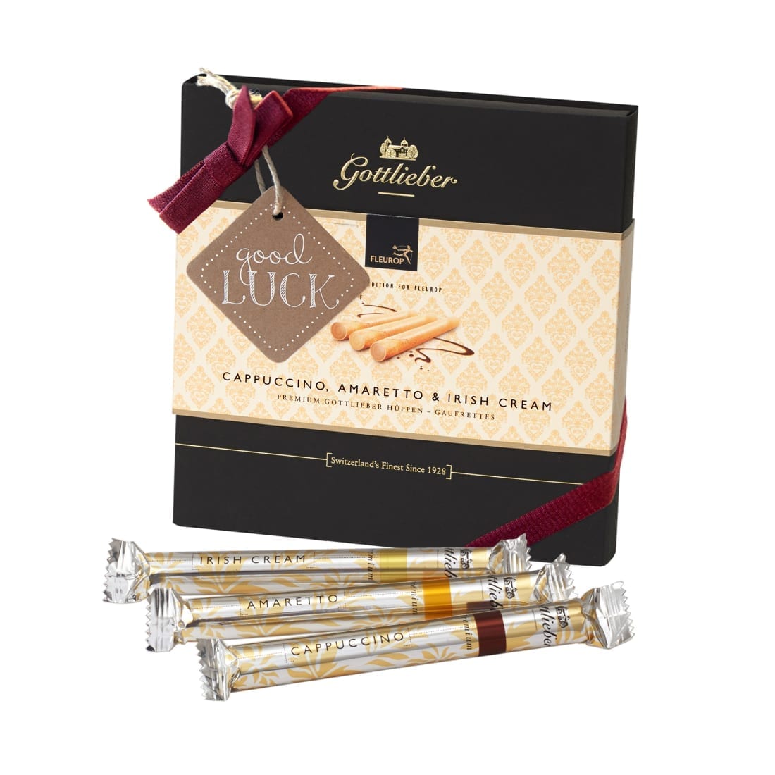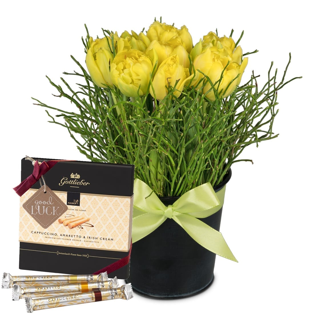 Dieser Blumengruss wird mit einer Packung Gottlieber Premium Hüppen Special Edition for Fleurop inkl. eines «Good Luck» – Anhängers kombiniert.