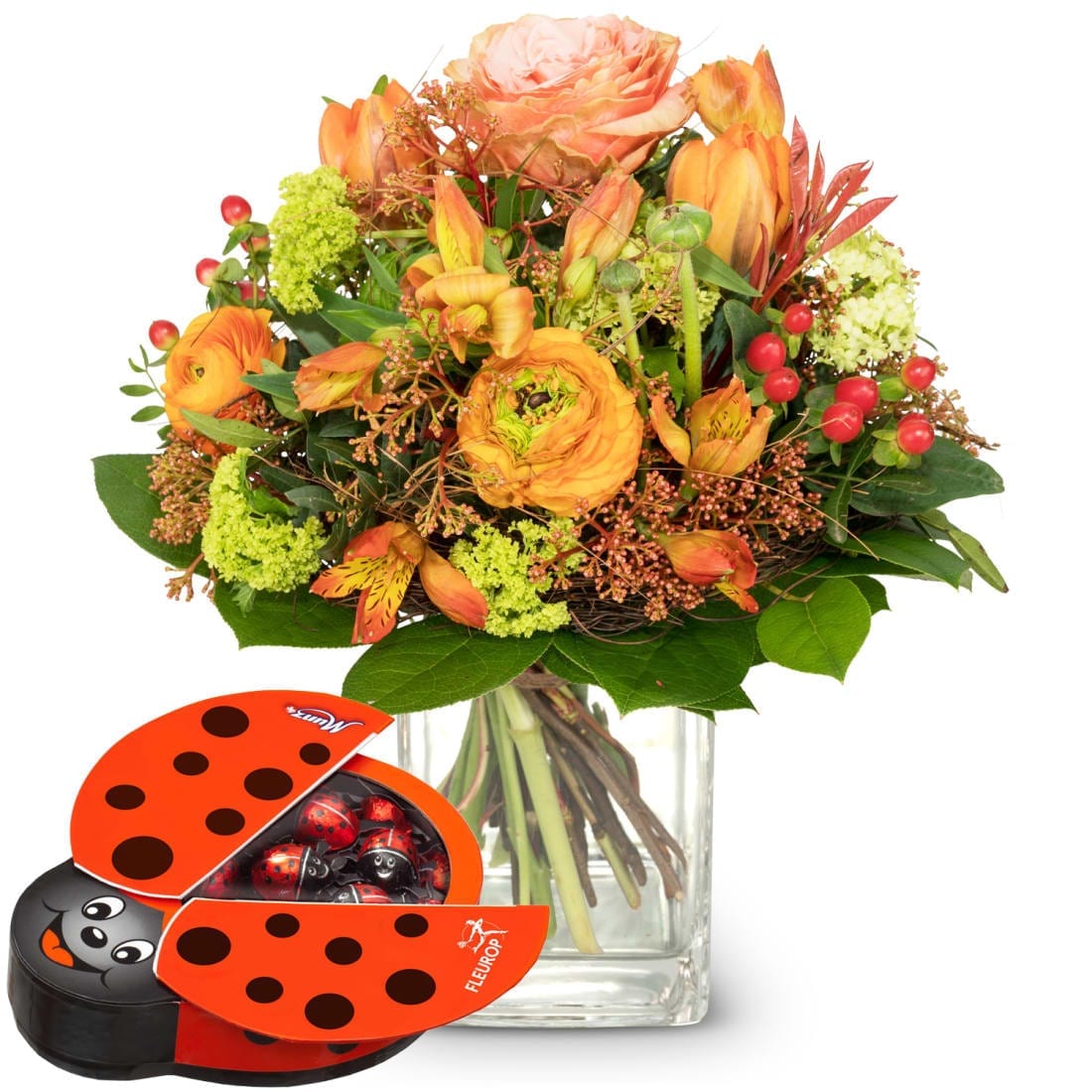 Ein fröhlicher Strauss, der Optimismus verbreitet und für unwiderstehlich gute Laune sorgt. Was will man mehr? Zu diesem Blumengruss wird eine Packung Schoggi-Glückskäfer von Munz kombiniert.