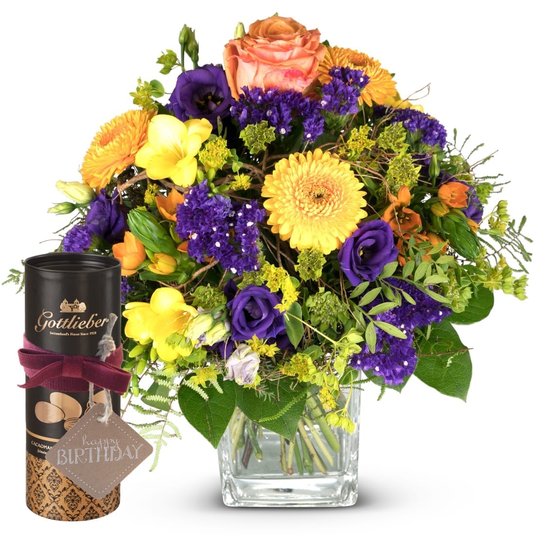 Mit diesem Strauss zaubern Sie im Nu Frühlingsstimmung. Da ist gute Laune vorprogrammiert. Dieser Blumengruss wird mit einer edlen Runddose Gottlieber Cacaomandeln (200g) inkl. eines «Happy Birthday» Anhängers kombiniert.