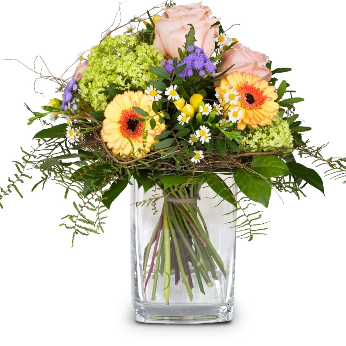 Dieser Strauss ist frisch, fröhlich und voller Energie. Schenken Sie einen Tag voll Freude, Sonne und guten Momenten.