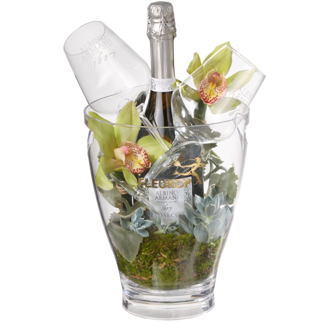 Als Blumengruss wird eine Flasche exklusiver Prosecco Albino Armani DOC Extra Dry (75 cl) im trendigen Eiskühler floral dekoriert und mit zwei Connaisseur-Gläsern überbracht.