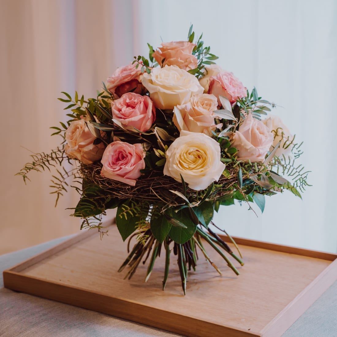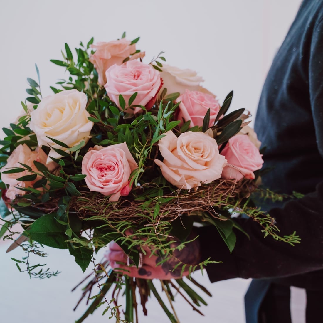Dieser Strauss ist wie eine Melodie aus zauberhaften «Farbtönen». Mit zarten Rosen und verspieltem Grün wird er von Romantikern sicher gleich ins Herz geschlossen.