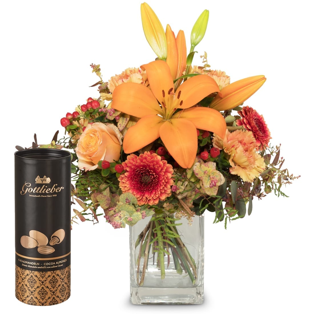 Dieser Blumengruss wird mit einer edlen Runddose Gottlieber Cacaomandeln (200g) kombiniert.