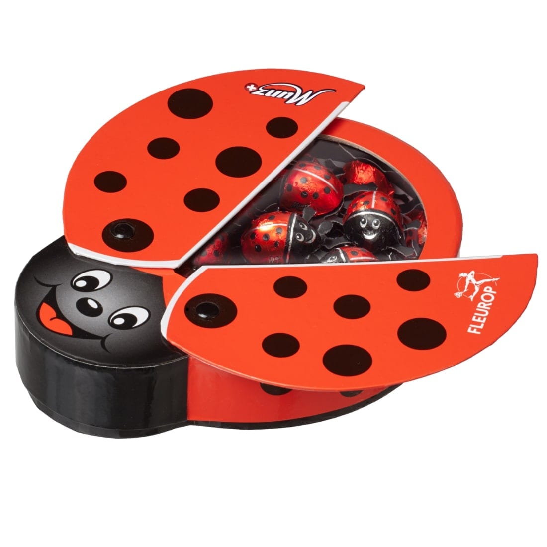 Diese originelle Packung beinhaltet 32 kleine Glückskäfer, 150g feinste schweizer Milchschokolade mit Pralinéfüllung.