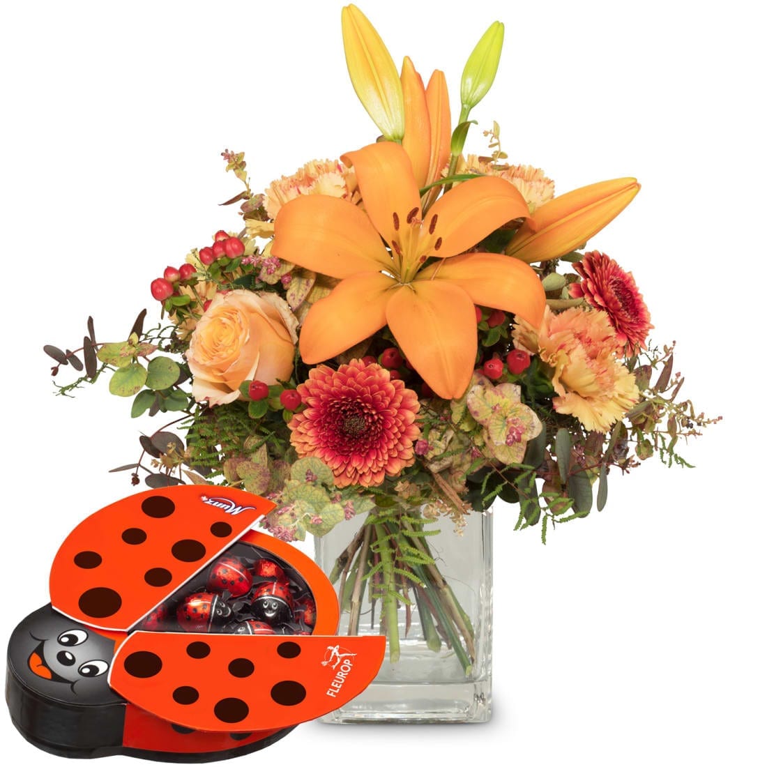 Zu diesem Blumengruss wird eine Packung Schoggi-Glückskäfer von Munz kombiniert.