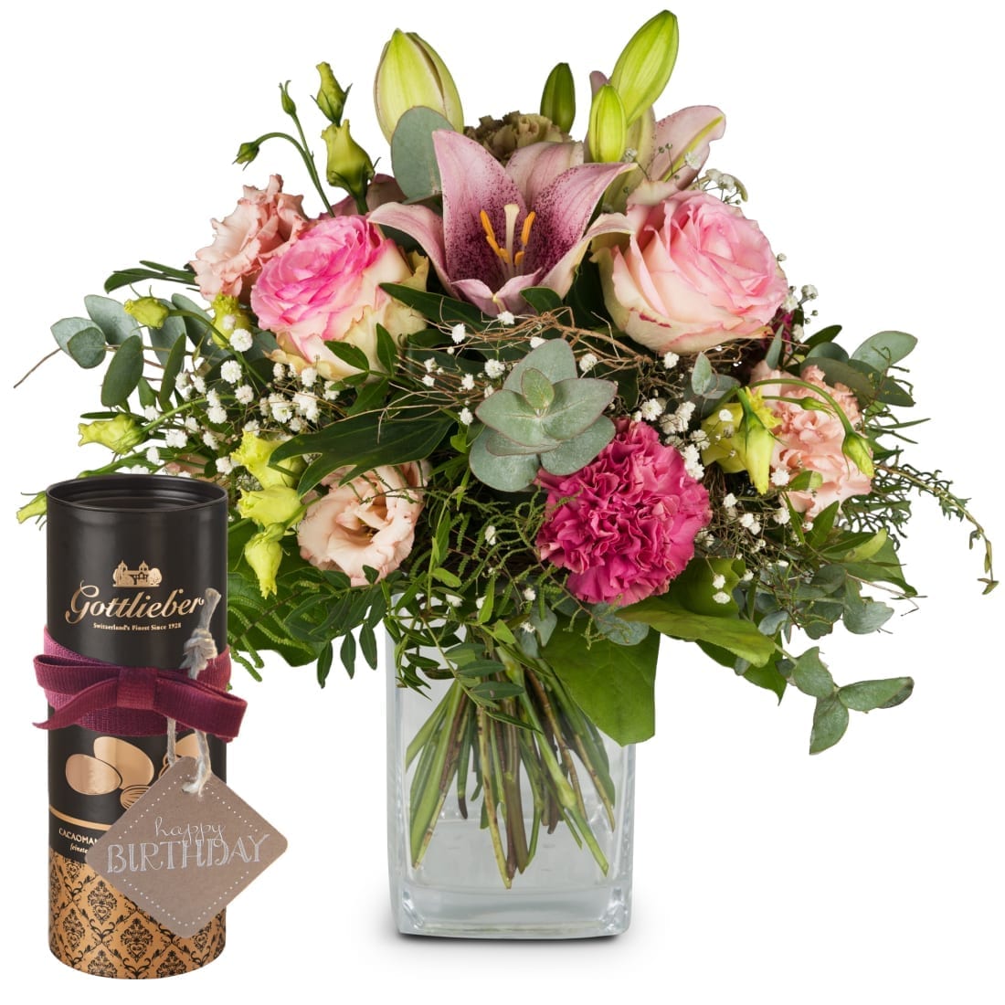 Lilien-Zauber mit Gottlieber Cacaomandeln und «Happy Birthday»-Anhänger