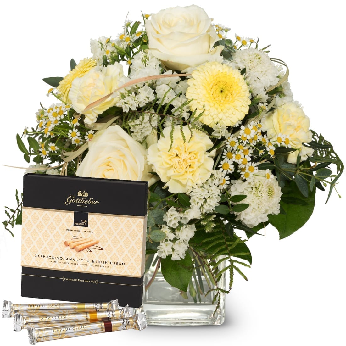 Mit diesem Blumengruss aus luftig-leichten Blumen wird jeder Tag zu etwas Besonderem. Dieser Blumengruss wird mit einer Packung Gottlieber Premium Hüppen Special Edition for Fleurop kombiniert.