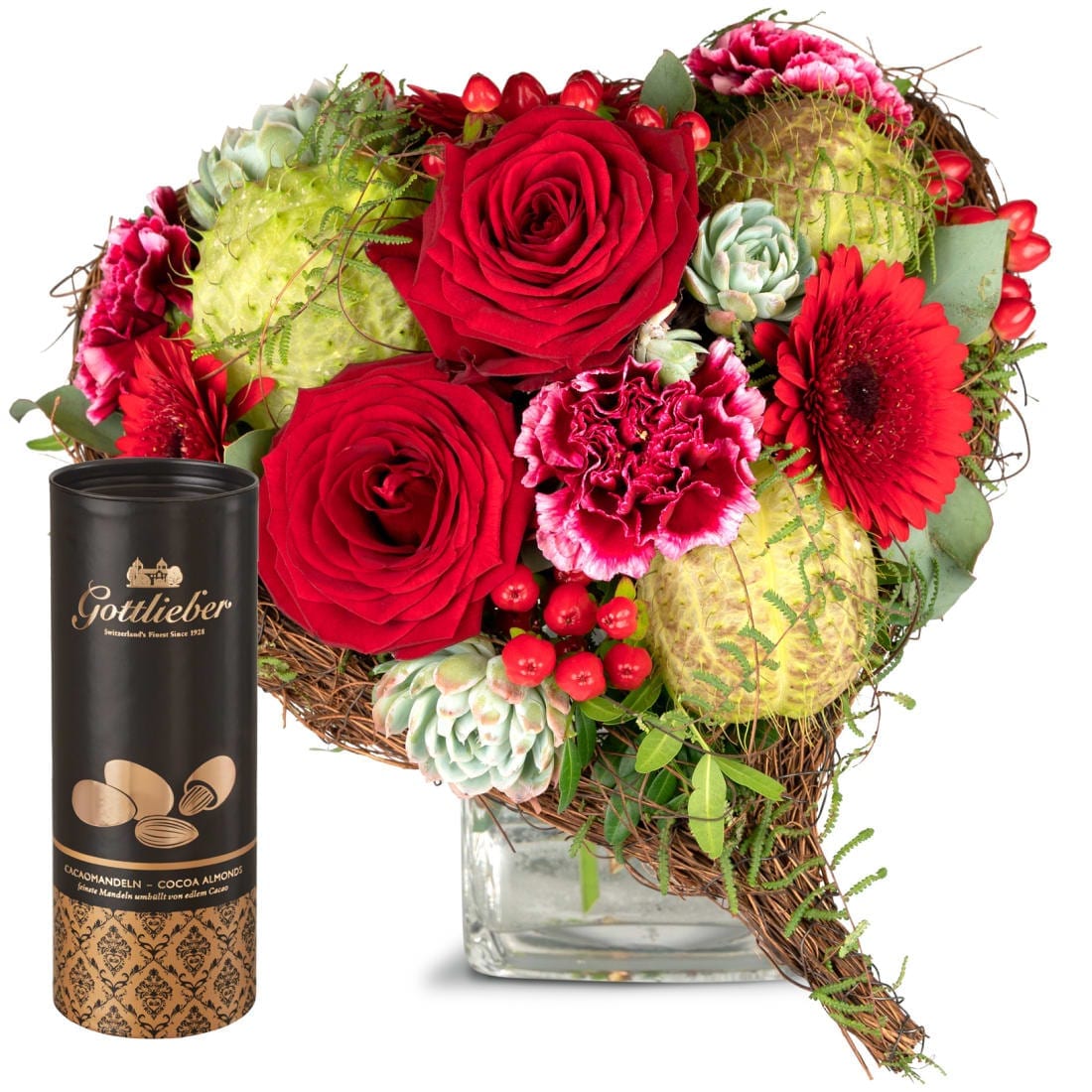 Ich habe dich gern. Deshalb soll es für dich etwas von Herzen sein. Dieser Blumengruss wird mit einer edlen Runddose Gottlieber Cacaomandeln (200g) kombiniert. Die Mandeln werden schonend geröstet, von zartschmelzender Schokolade umhüllt und mit edlem Kakaopulver bestäubt. Das Bild entspricht der mittleren Preisvariante und die Vase ist nicht inbegriffen. Auf Wunsch bestellen Sie diese weiter unten bei den Zusatzartikeln.