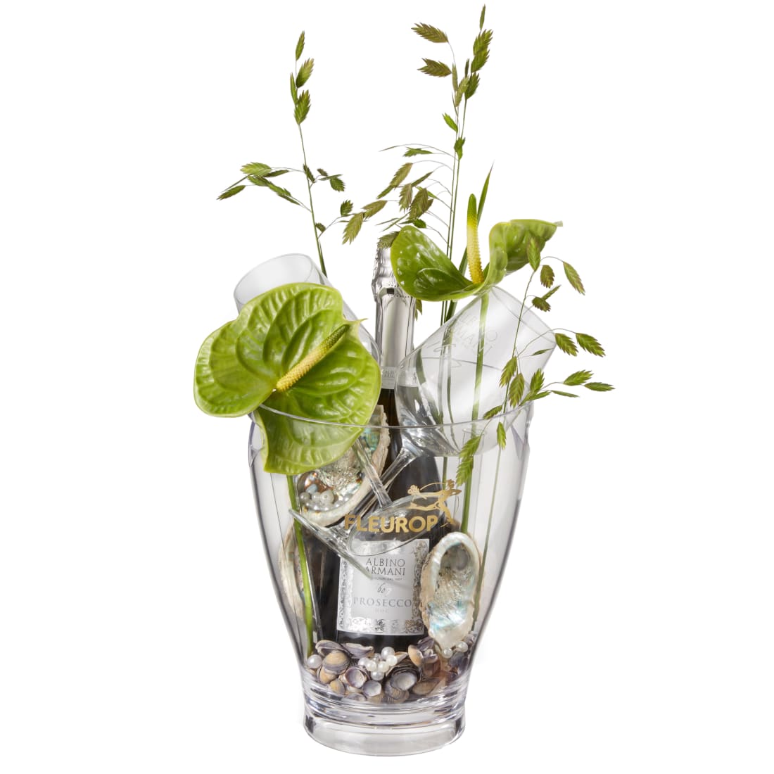 Als Blumengruss wird eine Flasche exklusiver Prosecco Albino Armani DOC Extra Dry (75 cl) im trendigen Eiskühler floral dekoriert und mit zwei Connaisseur-Gläsern überbracht.
