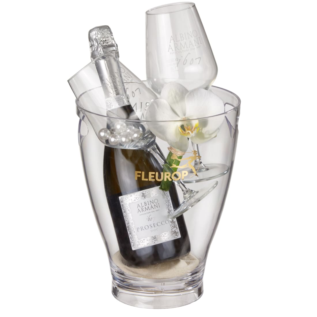 Als Blumengruss wird eine Flasche exklusiver Prosecco Albino Armani DOC Extra Dry (75 cl) im trendigen Eiskühler floral dekoriert und mit zwei Connaisseur-Gläsern überbracht.