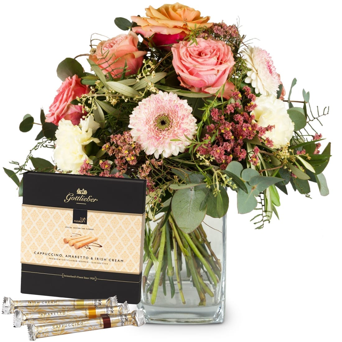 Pastell eignet sich hervorragend für Liebhaber zarter Farbtöne. Wie sagt man so schön: «C’est le ton qui fait la musique». Zu diesem Blumengruss wird eine Packung Gottlieber Premium Hüppen „Special Edition for Fleurop“ kombiniert.