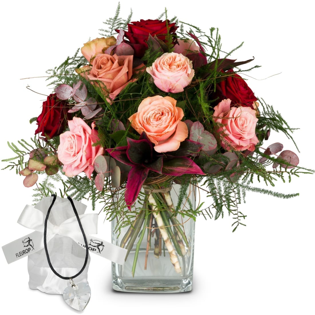 Eine Romanze wie aus dem Märchen. Mit diesem Strauss werden Träume wahr. Zart und magisch, verzaubert dieser Strauss jedes Herz. Zu Ihrem Blumengruss wird ein Swarovski® Kristallherz an schwarzem Satinband in silberfarbenem Organzabeutel überbracht.