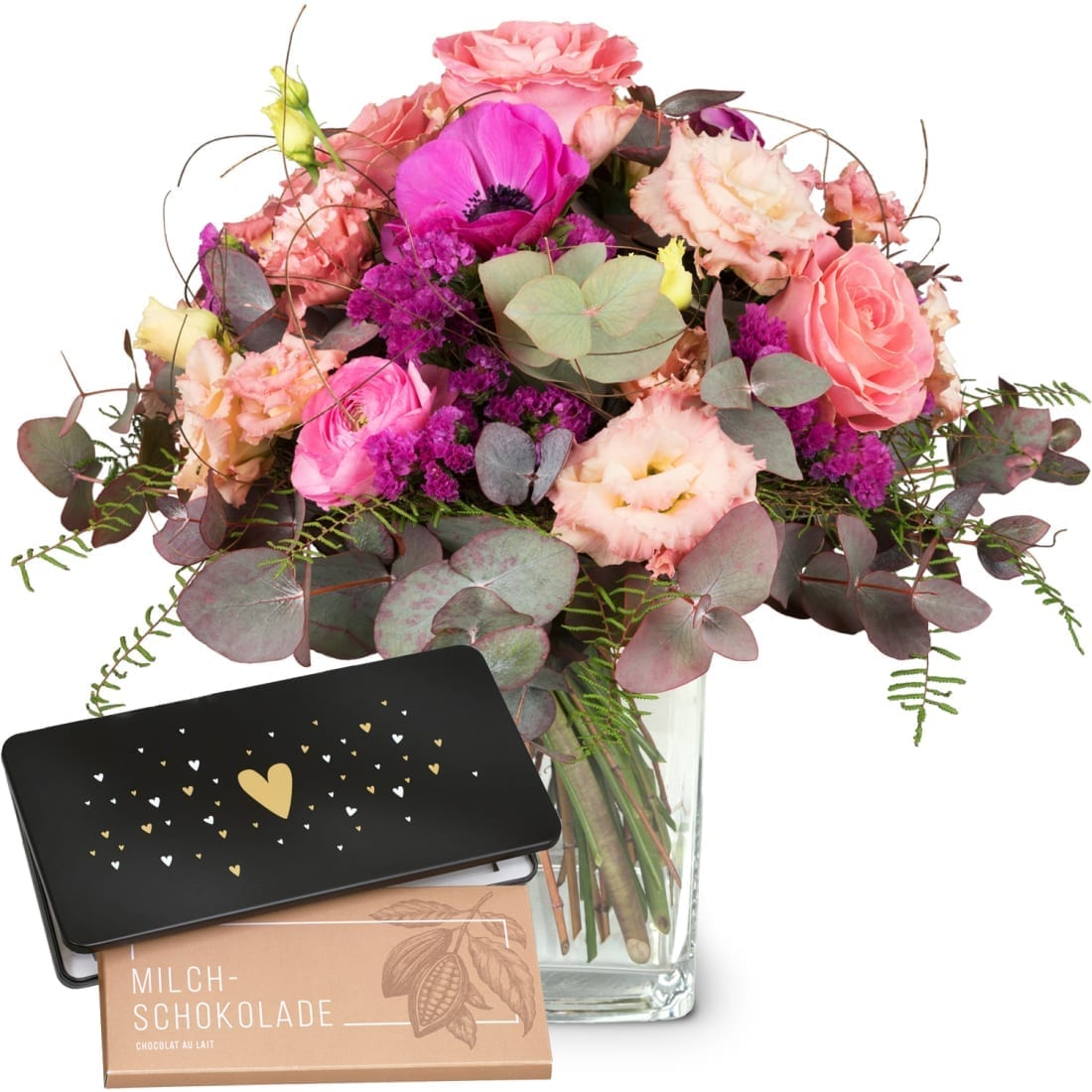 Mit Ihrem Blumengruss wird eine Tafel Schweizer Milchschokolade (100 g) von Munz in einer liebevoll gestalteten Geschenkdose überbracht.
