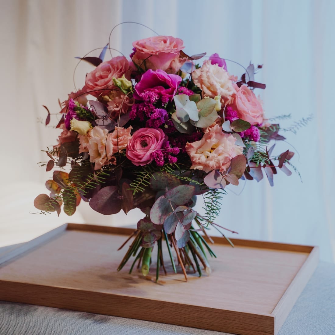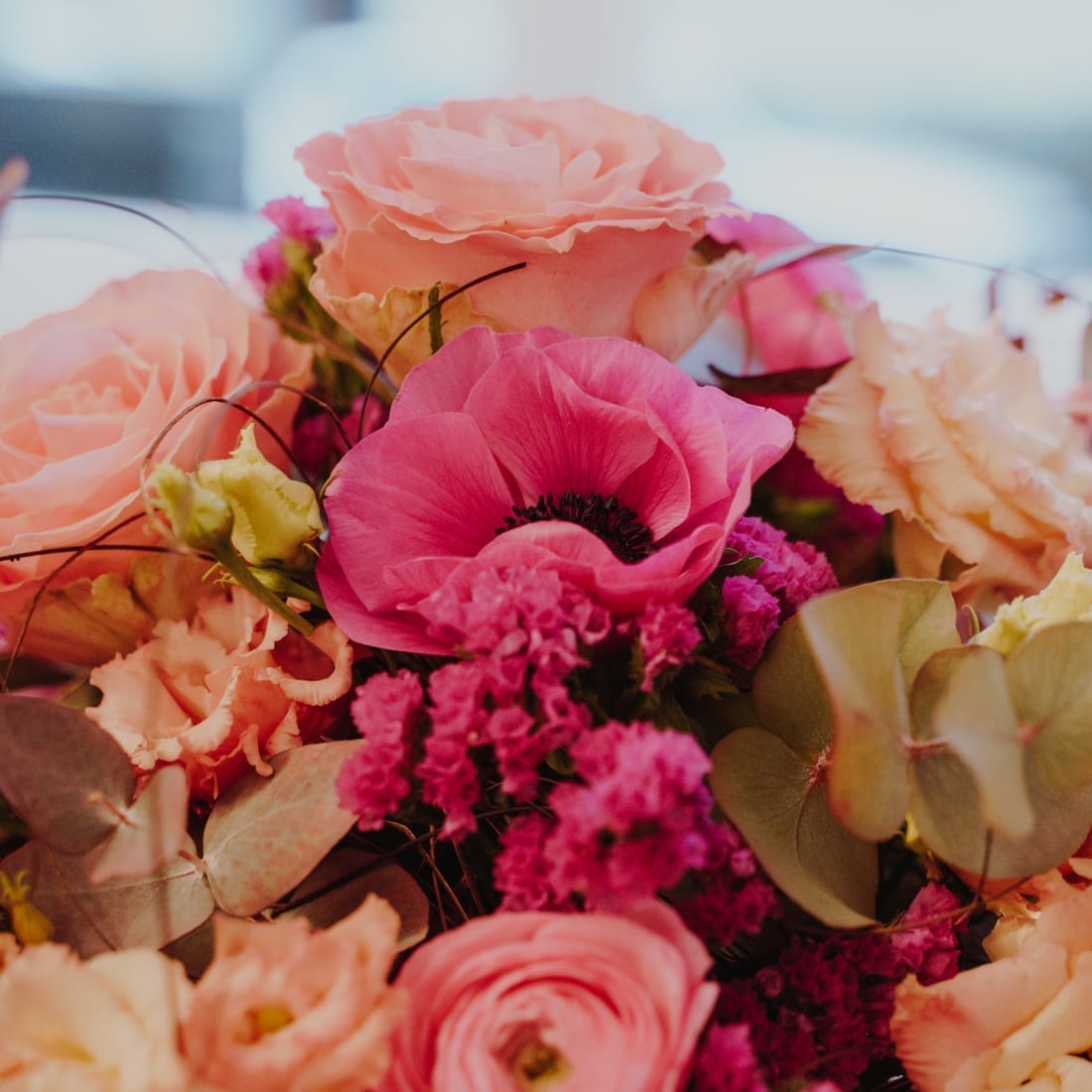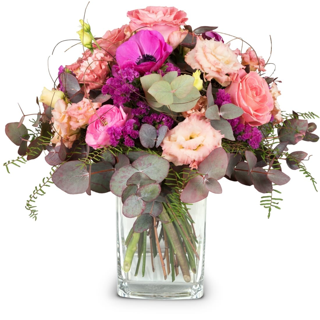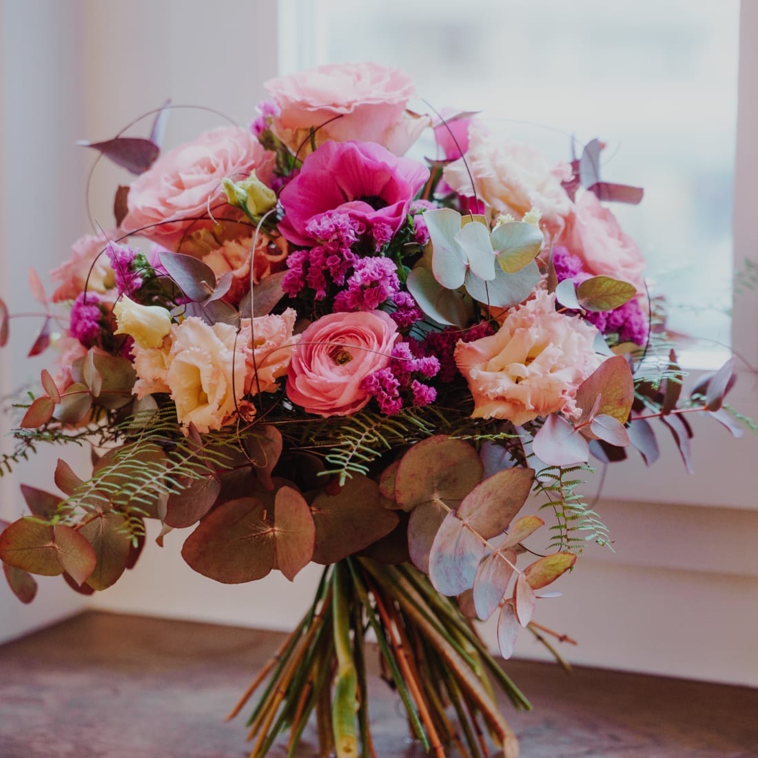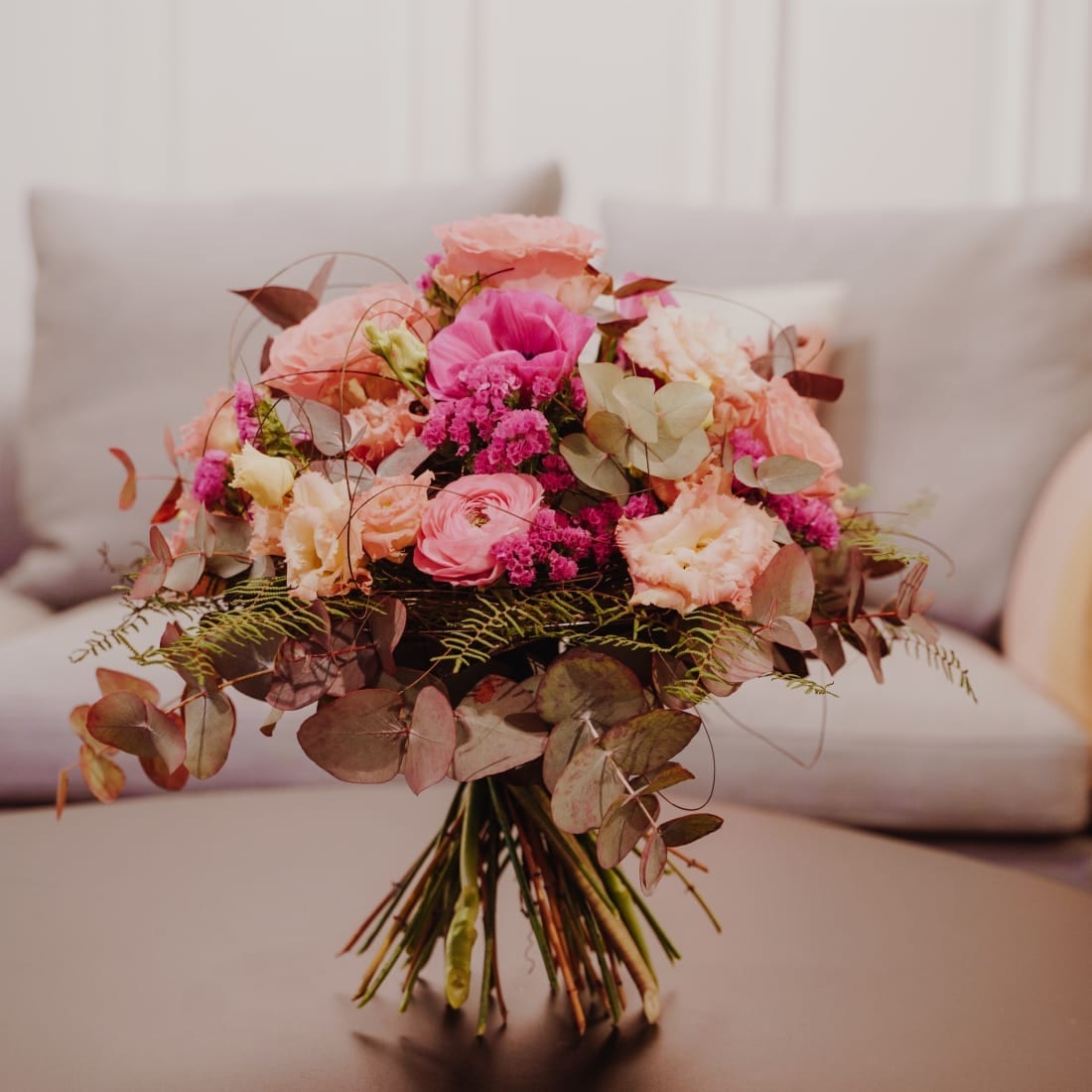Liebevoller Strauss in zarten Rosétönen und Highlights in Pink. Ein Geschenk, welches mit seinem Charme jedes Herz erobert.