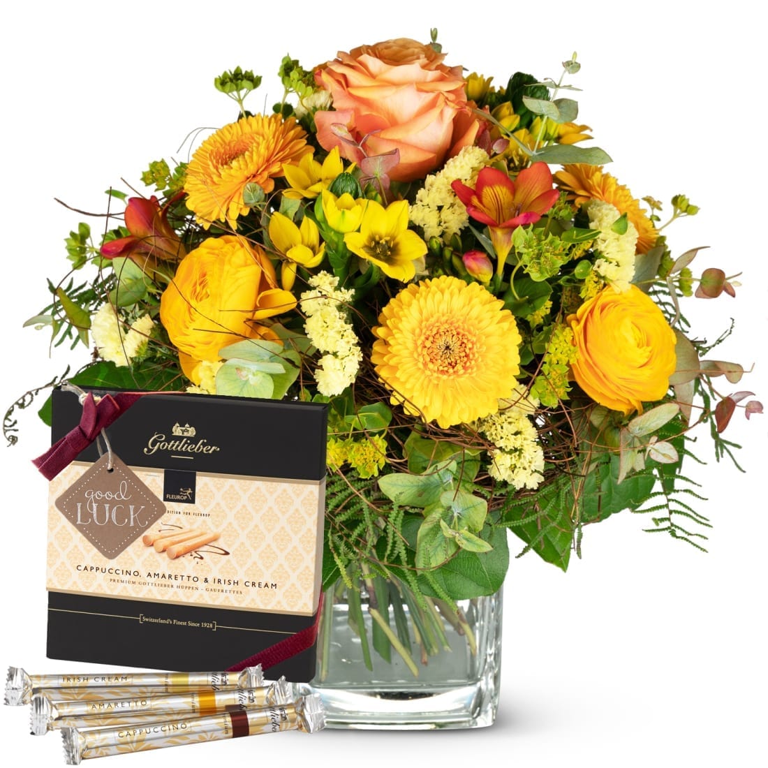 Dieser Blumengruss wird mit einer Packung Gottlieber Premium Hüppen „Special Edition for Fleurop“ inkl. eines «Good Luck»- Anhängers kombiniert.
