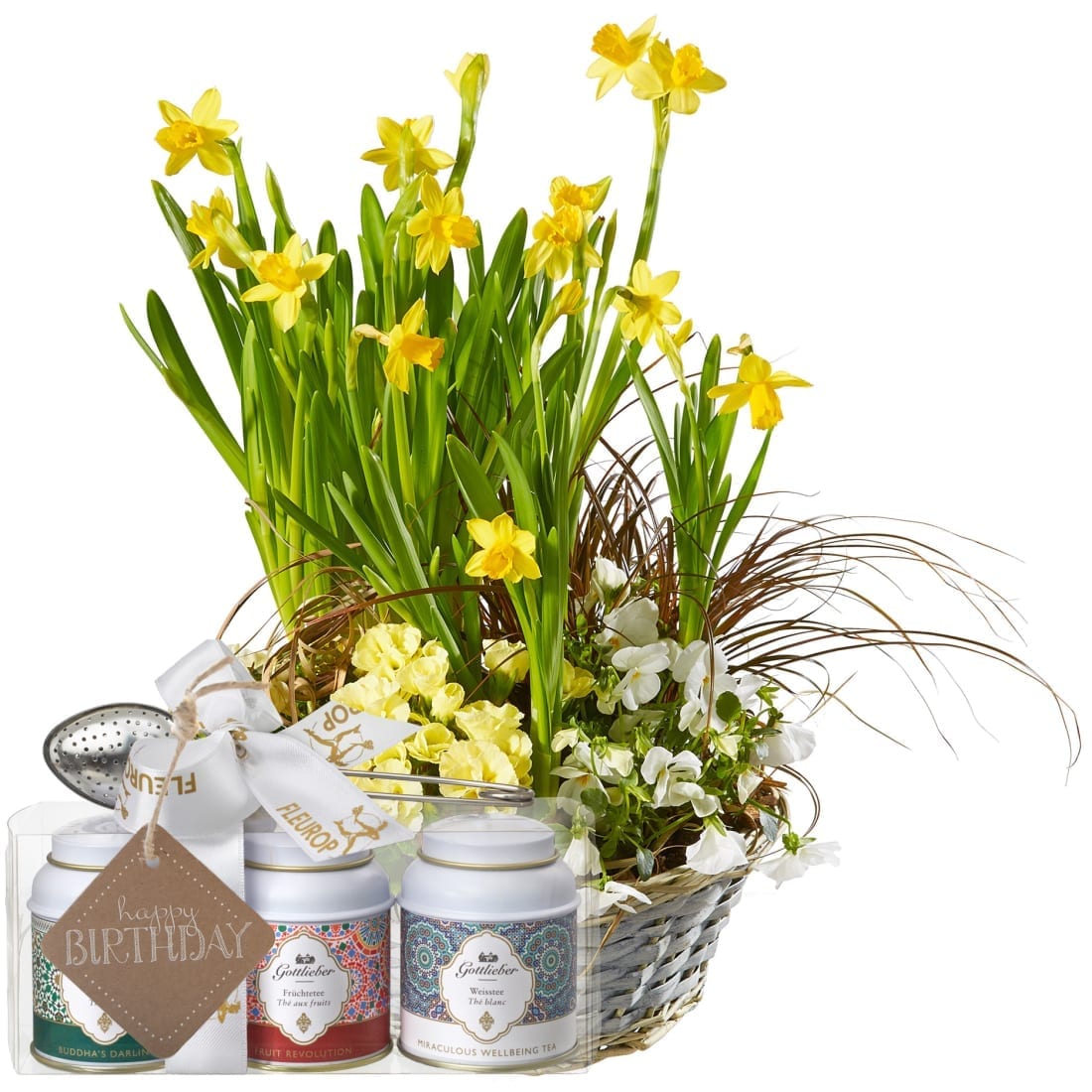 Sonniges Frühlingsgärtchen (gepflanzt) mit Gottlieber Tee Geschenk-Set und «Happy Birthday»-Anhänger
