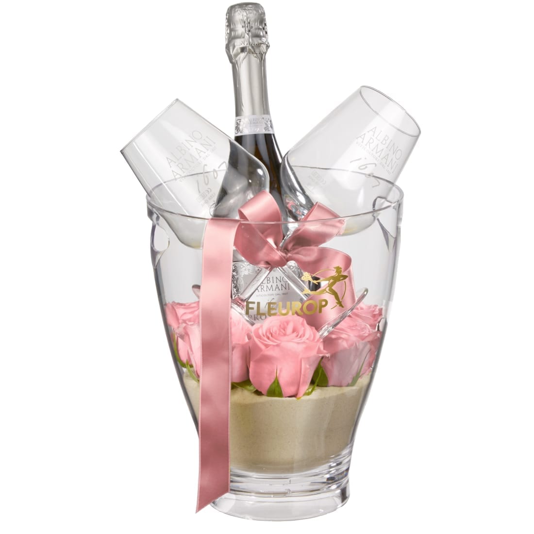 Als Blumengruss wird eine Flasche exklusiver Prosecco Albino Armani DOC Extra Dry (75 cl) im trendigen Eiskühler floral dekoriert und mit zwei Connaisseur-Gläsern überbracht.