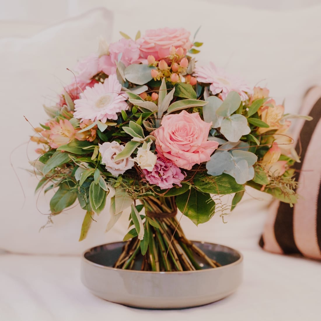 Dieser fröhliche Strauss in süssen Farben, eignet sich zur Geburt, als Geschenk unter Freundinnen oder Geburtstagsüberraschung. Da wird die Freude gross sein.