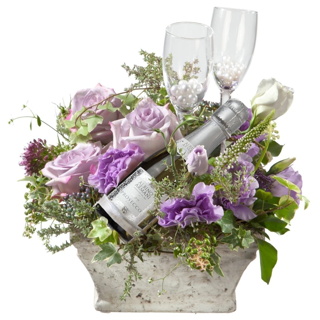 In diesen Blumengruss werden eine 20 cl Flasche exklusiver Prosecco Albino Armani DOC Extra Dry und zwei Gläser integriert.