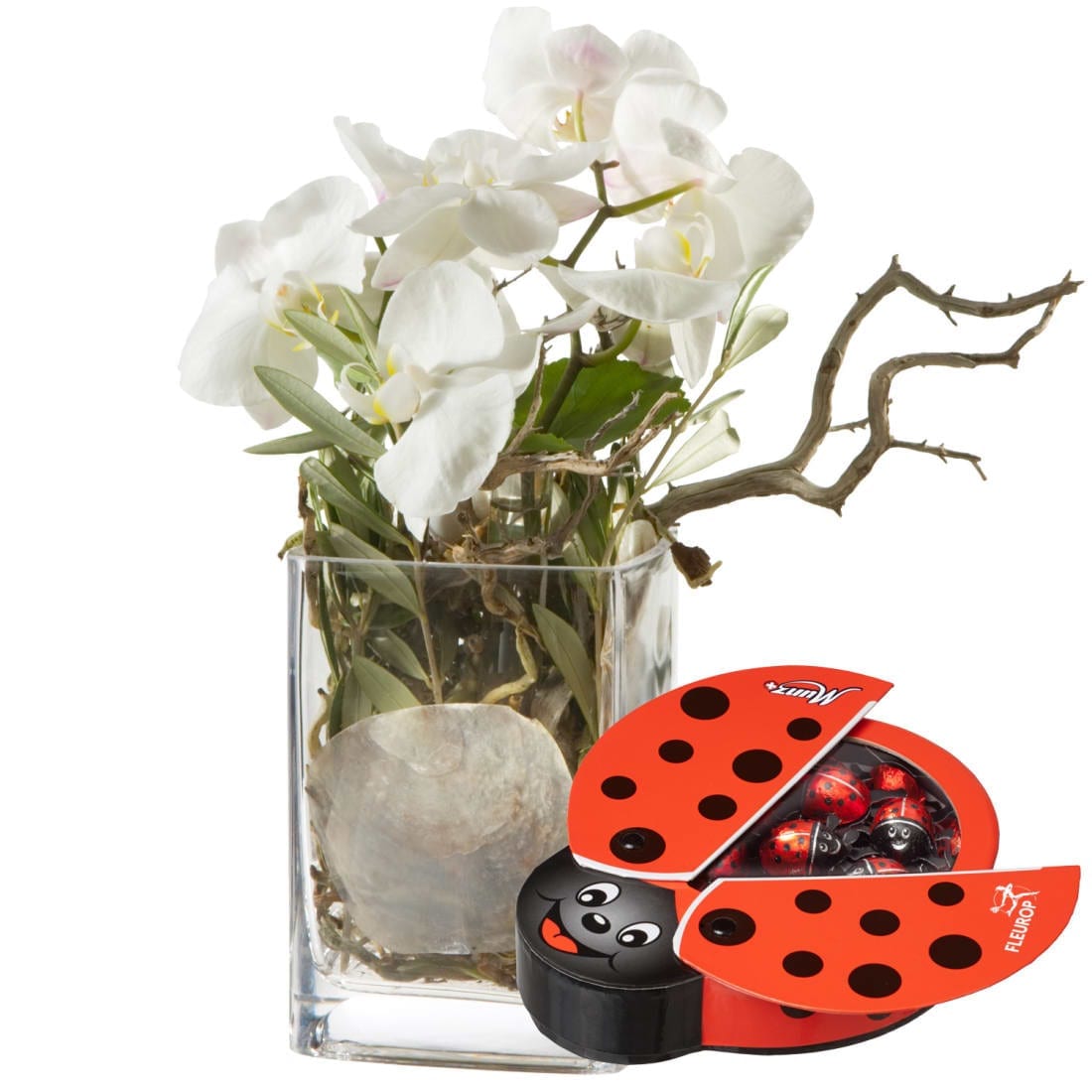 Zu diesem Blumengruss wird eine Packung Schoggi-Glückskäfer von Munz kombiniert. Diese originelle Packung beinhaltet 32 kleine Glückskäfer, 150g feinste schweizer Milchschokolade mit Pralinéfüllung. Dieses Werkstück wird vor Ort individuell und frisch zusammengestellt, je nach Erhältlichkeit mit Schnitt-Orchideen oder mit einer Orchideenpflanze, so dass es der Abbildung in Form und Farbe möglichst entspricht.Die optimale Gestaltung des Präsents liegt in den kompetenten Händen unserer Partner-Floristen.