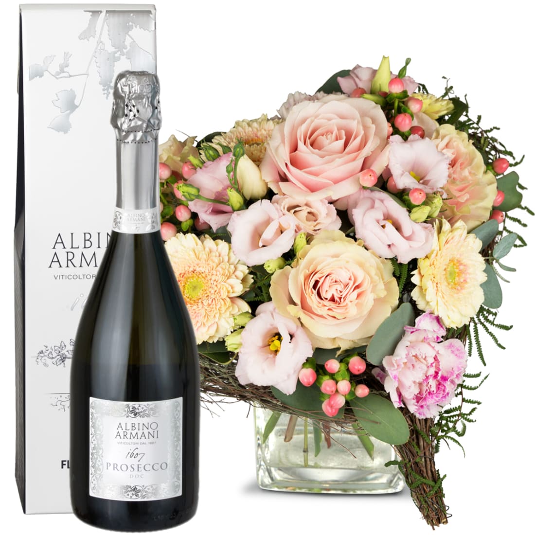 Der Frühling hält nicht nur draussen Einzug, auch im Herzen wird es wohlig warm. Mit dieser edlen Blumenperle und Ihrem persönlichen Kartentext bringen Sie Ihre Botschaft liebevoll und unvergesslich zum Ausdruck. Mit Ihrem Blumengruss wird eine Flasche exklusiver Prosecco Albino Armani DOC Extra Dry (75cl) in einer eleganten Geschenkbox überbracht.