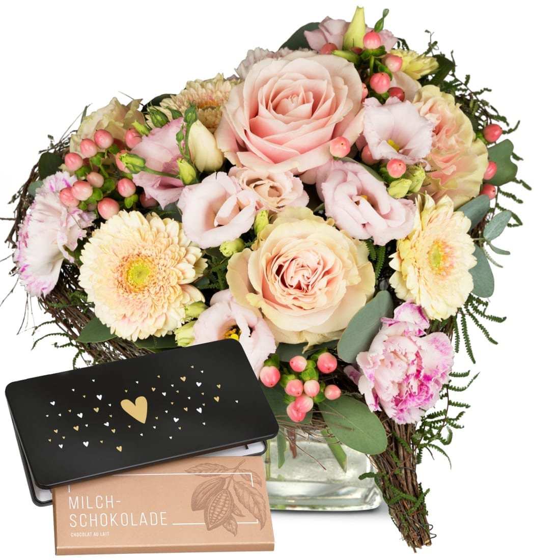 Die Botschaft ist klar: von Herzen soll es sein. Mit Ihrem Blumengruss wird eine Tafel Schweizer Milchschokolade (100 g) von Munz in einer liebevoll gestalteten Geschenkdose überbracht.