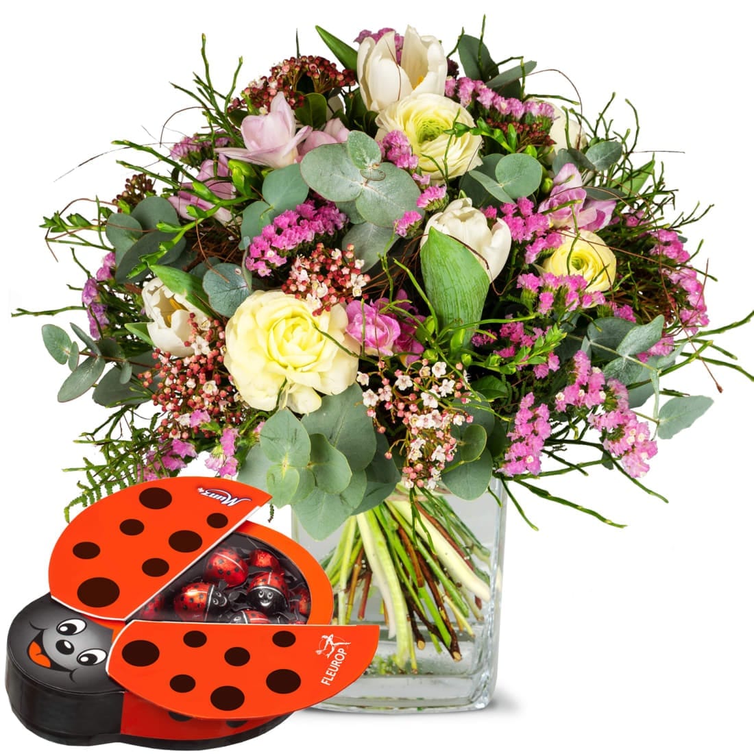 Verspielt, zart und voller Freude: Wir alle lieben den Frühling. Schenken Sie jemandem ein kleines Stück dieser wundervollen Jahreszeit. Zu diesem Blumengruss wird eine Packung Schoggi-Glückskäfer von Munz kombiniert. Diese originelle Packung beinhaltet 32 kleine Glückskäfer, 150g feinste schweizer Milchschokolade mit Pralinéfüllung.